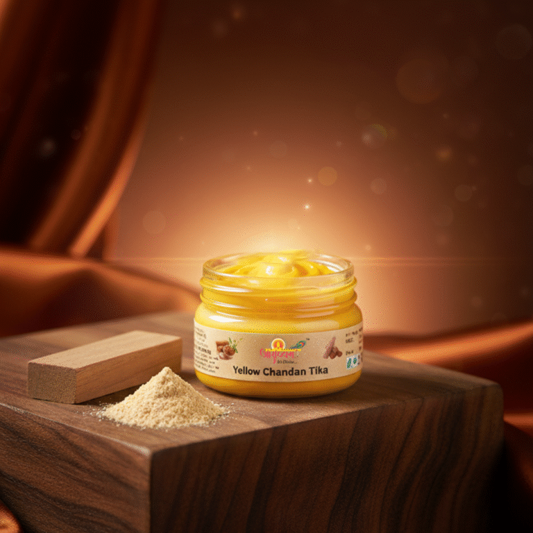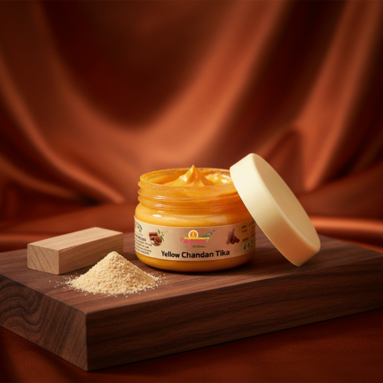 Experience divine purity with Pooja Chandan Tika (Yellow) — specially prepared for religious and spiritual rituals. Each bead of Chandan (sandalwood) carries a soothing aroma and sacred essence, perfect for daily pooja, havan, or temple use. Known for its natural fragrance and purity.